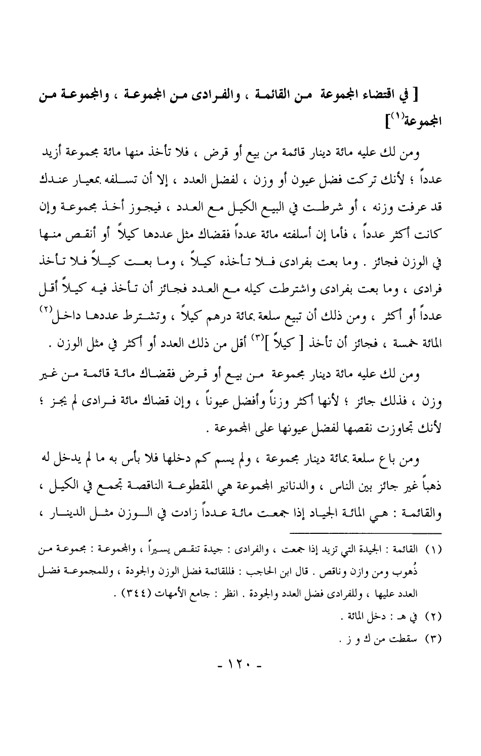 ومن لك عليه مائة دينار مجموعة من بيع أو قرض فقضاك مائة قائمة من غير وزن، فذلك جائز، لأنها أكثر وزناً وأفضل عيوناً، وإن قضاك مائة فرادى لم يجز، لأنك تجاوزت نقصها لفضل عيونها على المجموعة.