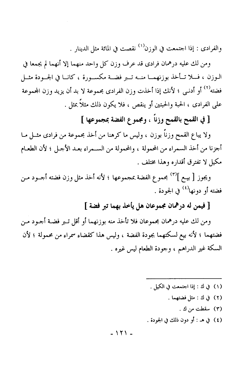 ومن لك عليه درهمان فرادى قد عرف وزن كل واحد منهما إلا أنهما لم يجمعا في الوزن، فلا تأخذ بوزنهما منه تبر فضة مكسورة، كانا في الجودة مثل فضته أو أدنى، لأنك إذا أخذت وزن الفرادى مجموعة لا بد أن يزيد وزن المجموعة على الفرادى، الحبة والحبتين أو ينقص، فلا يكون ذلك مثلاً بمثل.