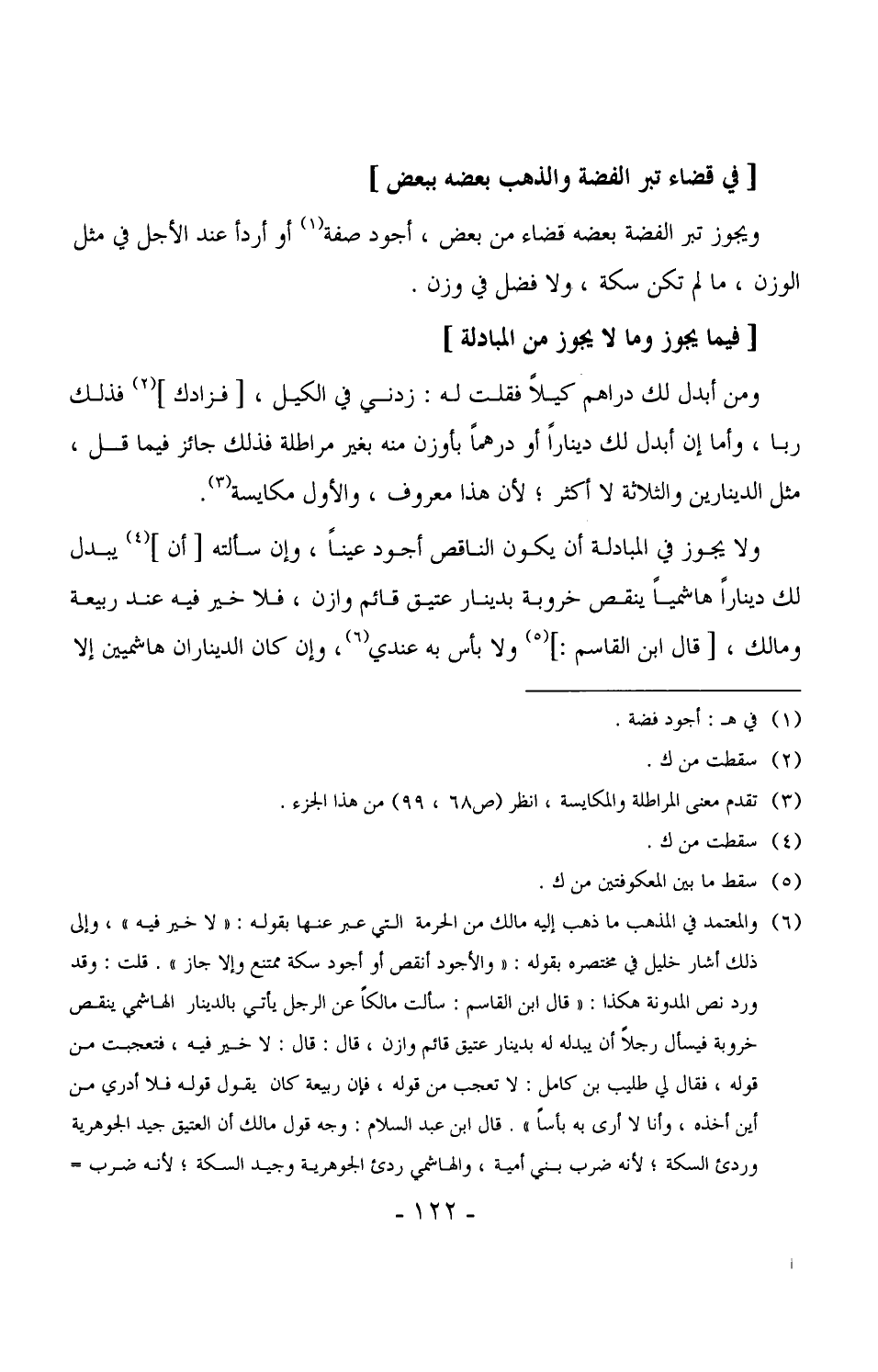 ولا يجوز في المبادلة أن يكون الناقص أجود عيناً، وإن سألته [أن] يبدل لك ديناراً هاشمياً ينقص خروبة بدينار عتيق قائم وازن، فلا خير فيه عند ربيعة ومالك، [قال ابن القاسم:] ولا بأس به عندي، وإن كان الديناران هاشميين إلا