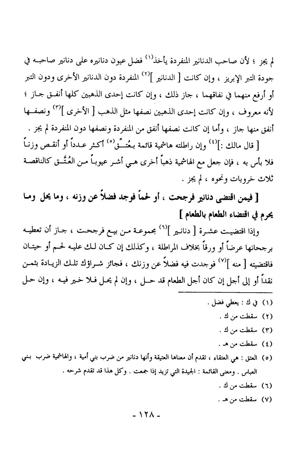 2552 - وإذا اقتضيت عشرة [دنانير] مجموعة من بيع فرجحت، جاز أن تعطيه برجحانها عرضاً أو ورقاً بخلاف المراطلة، وكذلك إن كان ذلك عليه لحم أو حيتان فاقتضيته [منه] فوجدت فيه فضلاً عن وزنك، فجائز شراؤك تلك الزيادة بثمن نقداً أو إلى أجل إن كان أجل الطعام قد حل، وإن لم يحل فلا خير فيه، وإن حل