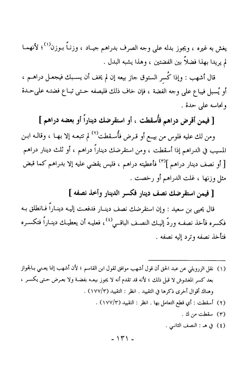 2557 - قال يحيى بن سعيد: وإن استقرضك نصف دينار فدفعت إليه ديناراً فانطلق به فكسره فأخذ نصفه وردّ إليك النصف الباقي، فعليه أن يعطيك ديناراً فتكسره فتأخذ نصفه وترد إليه نصفه.