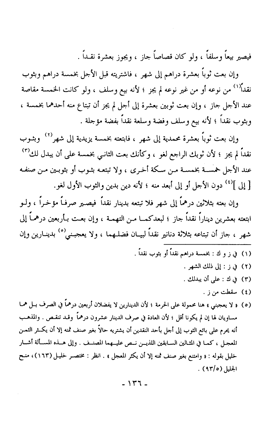 2565 - وإن بعت ثوباً بعشرة محمدية إلى شهر، فابتعته بخمسة يزيدية إلى شهر وبثوب نقداً لم يجز، لأن ثوبك الراجع لغو، وكأنك بعت الثاني بخمسة على أن يبدل لك عند الأجل خمسة بخمسة من سكة أخرى، ولا تبتعه بثوب أو بثوبين من صنفه [إلى] دون الأجل أو إلى أبعد منه، لأنه دين بدين والثوب الأول لغو.
