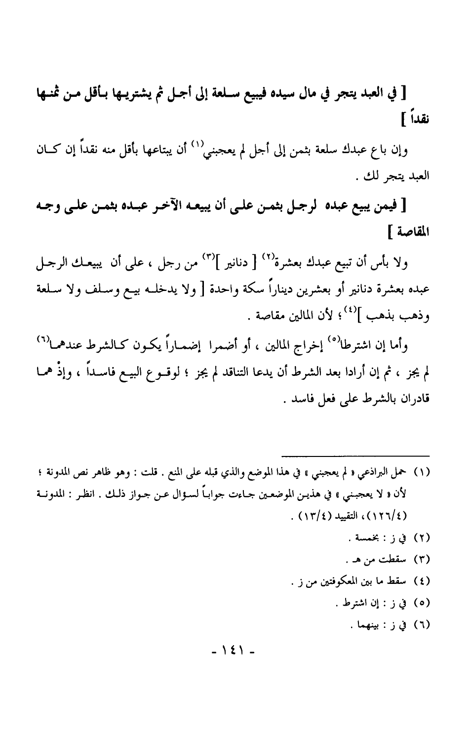 2572 - ولا بأس أن تبيع عبدك بعشرة [دنانير] من رجل، على أن يبيعك الرجل عبده بعشرة دنانير أو بعشرين ديناراً سكة واحدة [ولا يدخله بيع وسلف ولا سلعة وذهب بذهب] ، لأن المالين مقاصة.
