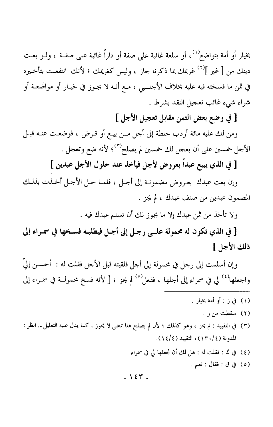 2577 - وإن بعت عبدك بعروض مضمونة إلى أجل، فلما حل الأجل أخذت بذلك المضمون عبدين من صنف عبدك، لم يجز.