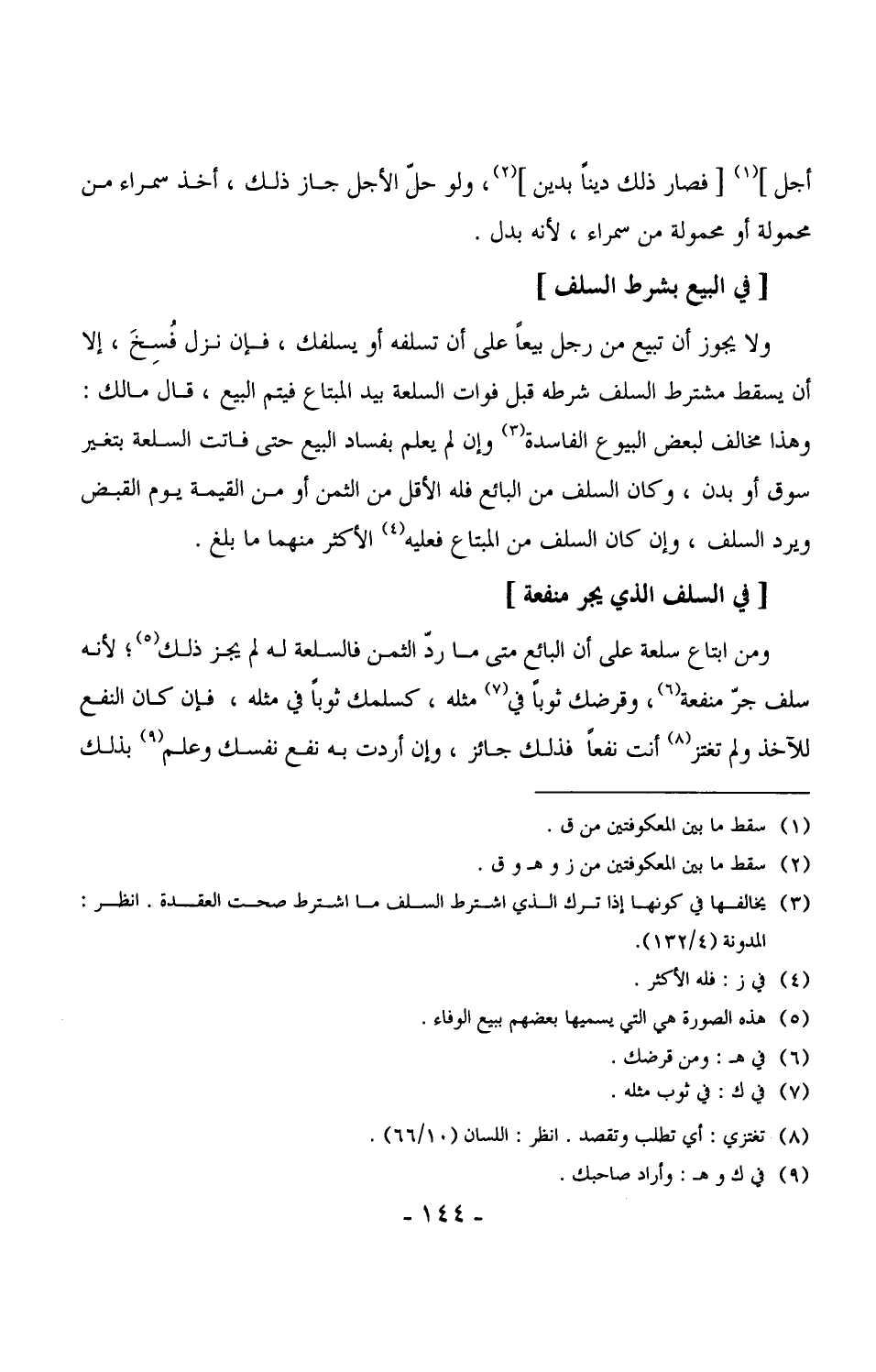 2580 - ومن ابتاع سلعة على أن البائع متى ما ردّ الثمن فالسلعة له لم يجز ذلك، لأنه سلف جرّ منفعة، وقرضك ثوباً في مثله، كسلمك ثوباً في مثله، فإن كان النفع للآخذ ولم تغتز أنت نفعاً فذلك جائز، وإن أردت به نفع نفسك وعلم بذلك