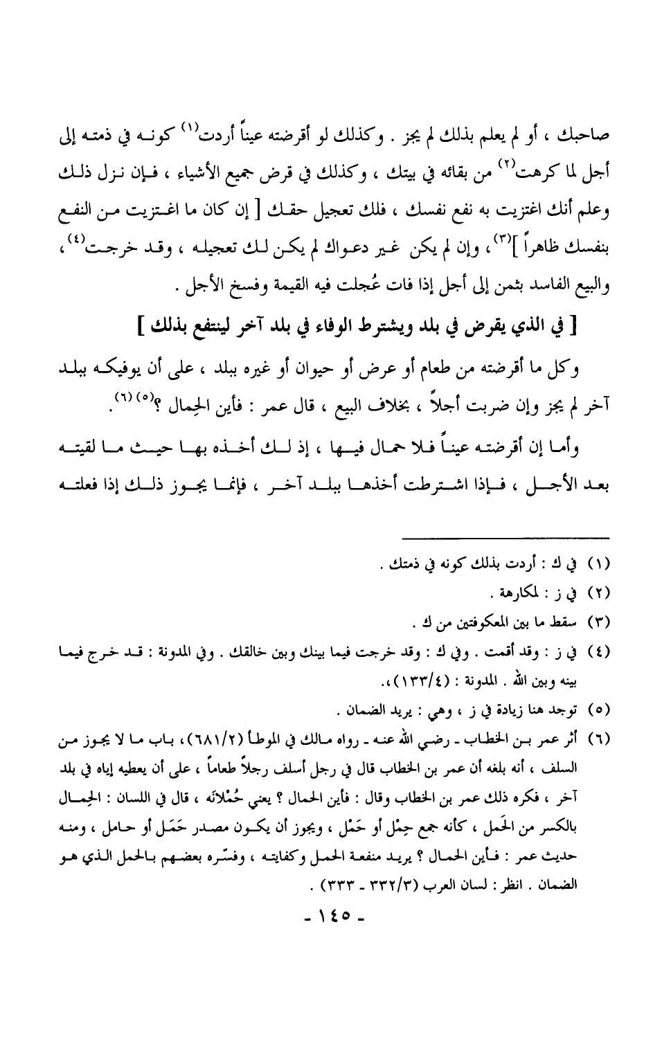 2581 - وكل ما أقرضته من طعام أو عرض أو حيوان أو غيره ببلد، على أن يوفيكه ببلد آخر لم يجز وإن ضربت أجلاً، بخلاف البيع، قال عمر: فأين الحِمال؟.