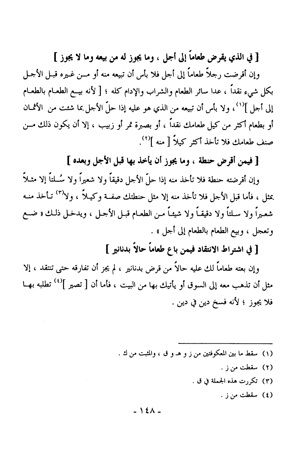 2584 - وإن أقرضت رجلاً طعاماً إلى أجل فلا بأس أن تبيعه منه أو من غيره قبل الأجل بكل شيء نقداً، عدا سائر الطعام والشراب والإدام كله، [لأنه بيع الطعام بالطعام إلى أجل] ، ولا بأس أن تبيعه من الذي هو عليه إذا حلّ الأجل بما شئت من الأثمان أو بطعام أكثر من كيل طعامك نقداً، أو بصيرة تمر أو زبيب، غلا أن يكون ذلك من صنف طعامك فلا تأخذ أكثر كيلاً [منه] .