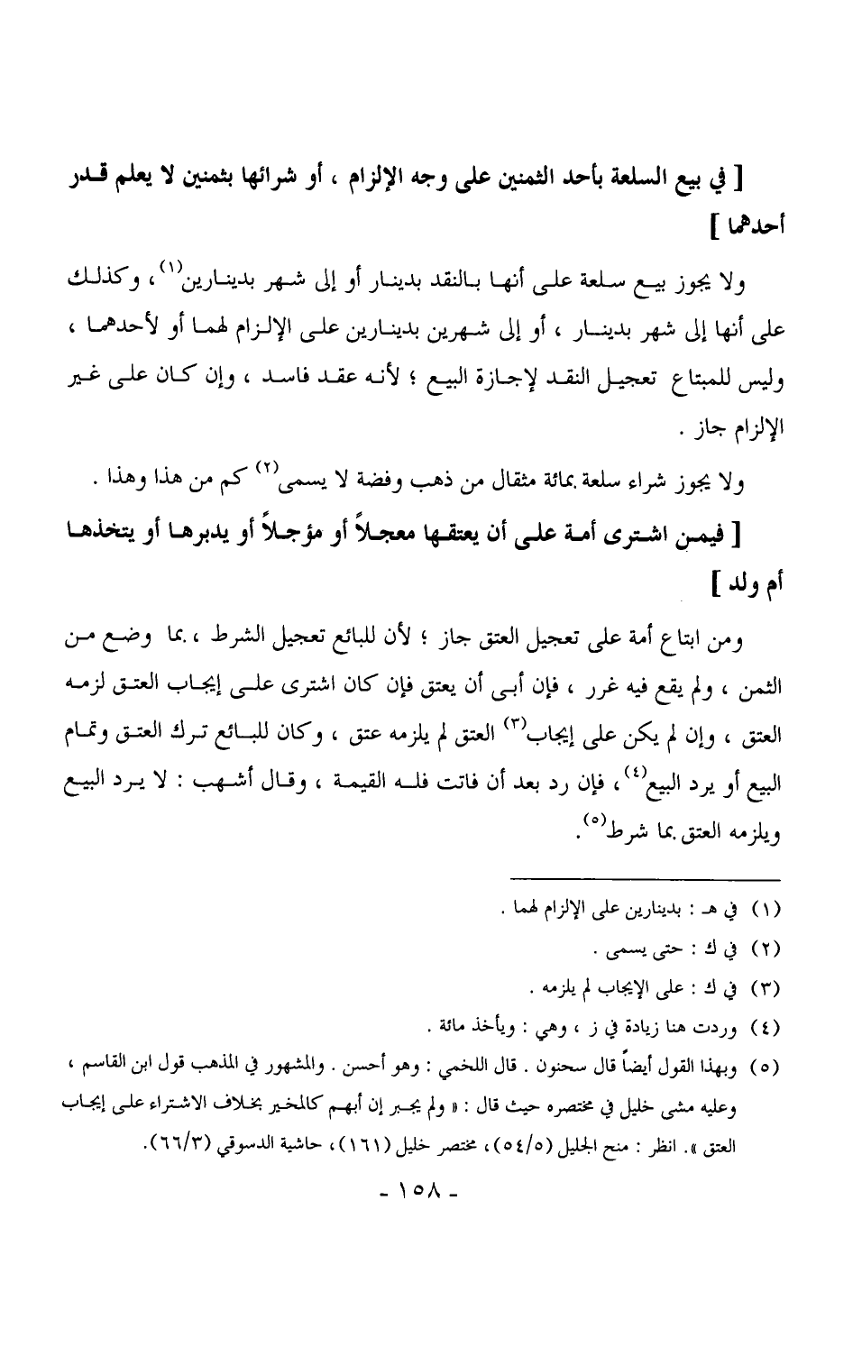 2601 - ولا يجوز بيع سلعة على أنها بالنقد بدينار أو إلى شهر بدينارين، وكذلك على أنها إلى شهر بدينار، أو إلى شهرين بدينارين على الإلزام لهما أو لأحدهما، وليس للمبتاع تعجيل النقد لإجازة البيع، لأنه عقد فاسد، وإن كان على غير الإلزام جاز.