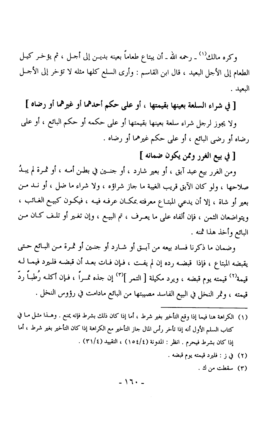 وكره مالك - رحمه الله - أن يبتاع طعاماً بعينه بدين إلى أجل، ثم يؤخر كيل الطعام إلى الأجل البعيد، قال ابن القاسم: وأرى السلع كلها مثله لا تؤخر إلى الأجل البعيد.