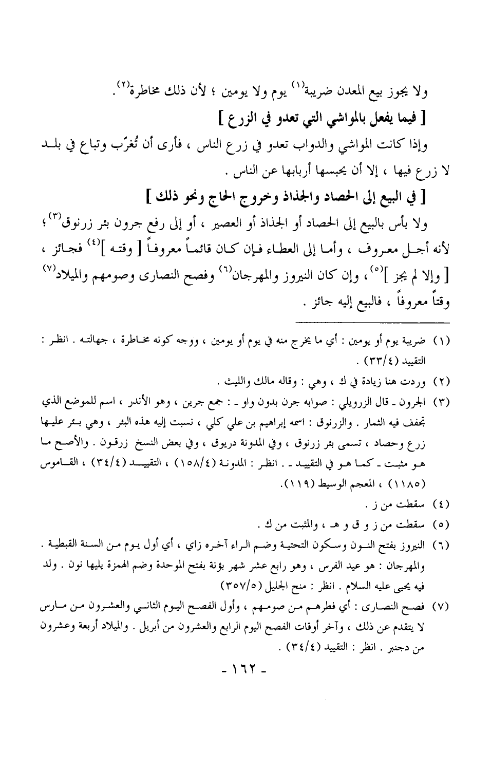 2609 - ولا بأس بالبيع إلى الحصاد أو الجذاذ أو العصير، أو إلى رفع جرون بئر زرنوق، لأنه أجل معروف، وأما إلى العطاء فإن كان قائماً معروفاً [وقته] فجائز، [وإلا لم يجز] ، وإن كان النيروز والمهرجان وفصح النصارى وصومهم والميلاد وقتاً معروفاً، فالبيع إليه جائز.