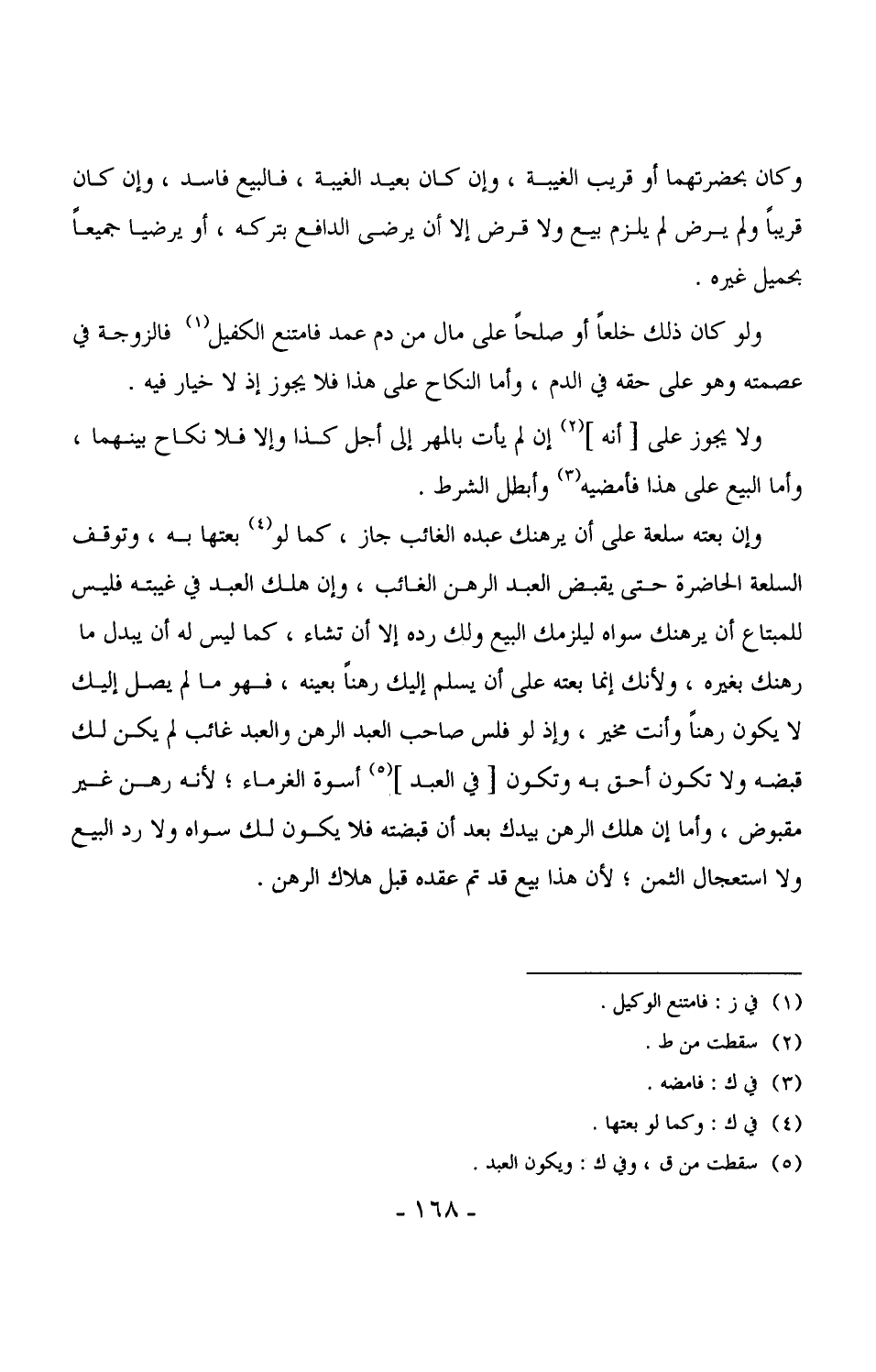 2617 - وإن بعته سلعة على أن يرهنك عبده الغائب جاز، كما لو بعتها به، وتوقف السلعة الحاضرة حتى يقبض العبد الرهن الغائب، وإن هلك العبد في غيبته فليس للمبتاع أن يرهنك سواه ليلزمك البيع ولك رده إلا أن تشاء، كما ليس له أن يبدل ما رهنك بغيره، ولأنك إنما بعته على أن يسلم إليك رهناً بعينه، فهو ما لم يصل إليك لا يكون رهناً وأنت مخير، وإذ لو فلس صاحب العبد الرهن والعبد غائب لم يكن لك قبضه ولا تكون أحق به وتكون [في العبد] أسوة الغرماء، لأنه رهن غير مقبوض، وأما إن هلك الرهن بيدك بعد أن قبضته فلا يكون لك سواه ولا رد البيع ولا استعجال الثمن، لأن هذا بيع قد تم عقده قبل هلاك الرهن. (¬1)