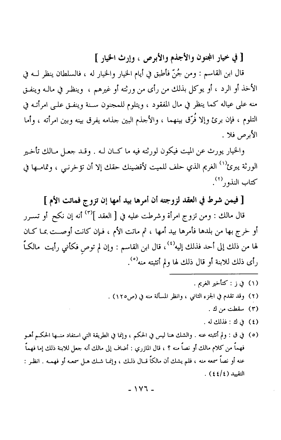 2626 - قال ابن القاسم: ومن جُنّ فأطبق في أيام الخيار والخيار له، فالسلطان ينظر له في الأخذ أو الرد، أو يوكل بذلك من رأى من ورثته أو غيرهم، وينظر في ماله وينفق منه على عياله كما ينظر في مال المفقود، ويتلوم للمجنون سنة وينفق على امرأته في التلوم، فإن برئ وإلا فُرّق بينهما، والأجذم البين جذامه يفرق بينه وبين امرأته، وأما الأبرص فلا.