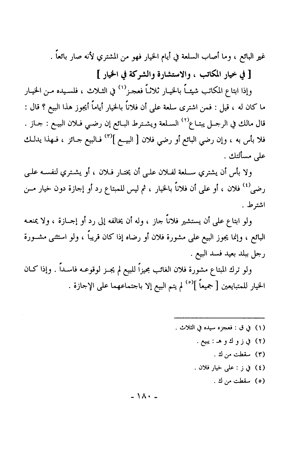 2635 - ولو ابتاع على أن يستشير فلاناً جاز، وله أن يخالفه إلى رد أو إجازة، ولا يمنعه البائع، وإنما يجوز البيع على مشورة فلان أو رضاه إذا كان قريباً، ولو استثنى مشورة رجل ببلد بعيد فسد البيع.