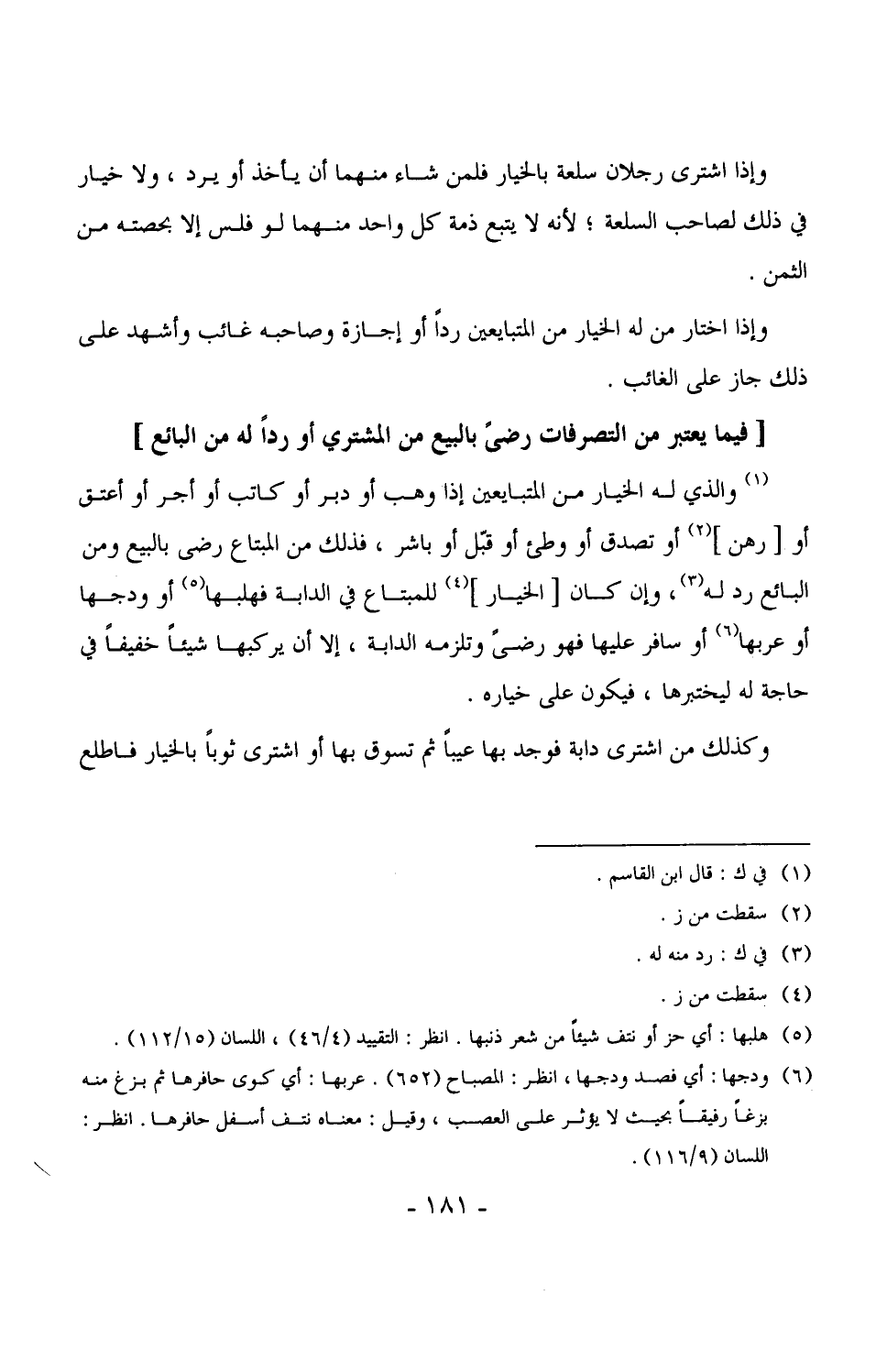 2636 - والذي له الخيار من المتبايعين إذا وهب أو دبر أو كاتب أو أجر أو أعتق أو [رهن] أو تصدق أو وطئ أو قبّل أو باشر، فذلك من المبتاع رضى بالبيع ومن البائع رد له، وإن كان [الخيار] للمبتاع في الدابة فهلبها أو ودجها أو عربها أو سافر عليها فهو رضىً وتلزمه الدابة، إلا أن يركبها شيئاً خفيفاً في حاجة له ليختبرها، فيكون على خياره.
