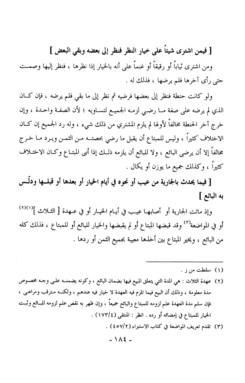 2640 - ومن اشترى ثياباً أو رقيقاً أو غنماً على أنه بالخيار إذا نظرها، فنظر إليها وصمت حتى رأى آخرها فلم يرضها، فذلك له.