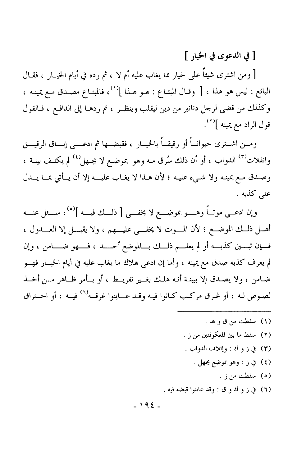2654 -[ومن اشترى شيئاً على خيار مما يغاب عليه أم لا، ثم رده في أيام الخيار، فقال البائع: ليس هو هذا، [وقال المبتاع: هو هذا] ، فالمبتاع مصدق مع يمينه، وكذلك من قضى لرجل دنانير من دين ليقلب وينظر، ثم ردها إلى الدافع، فالقول قول الراد مع يمينه] .