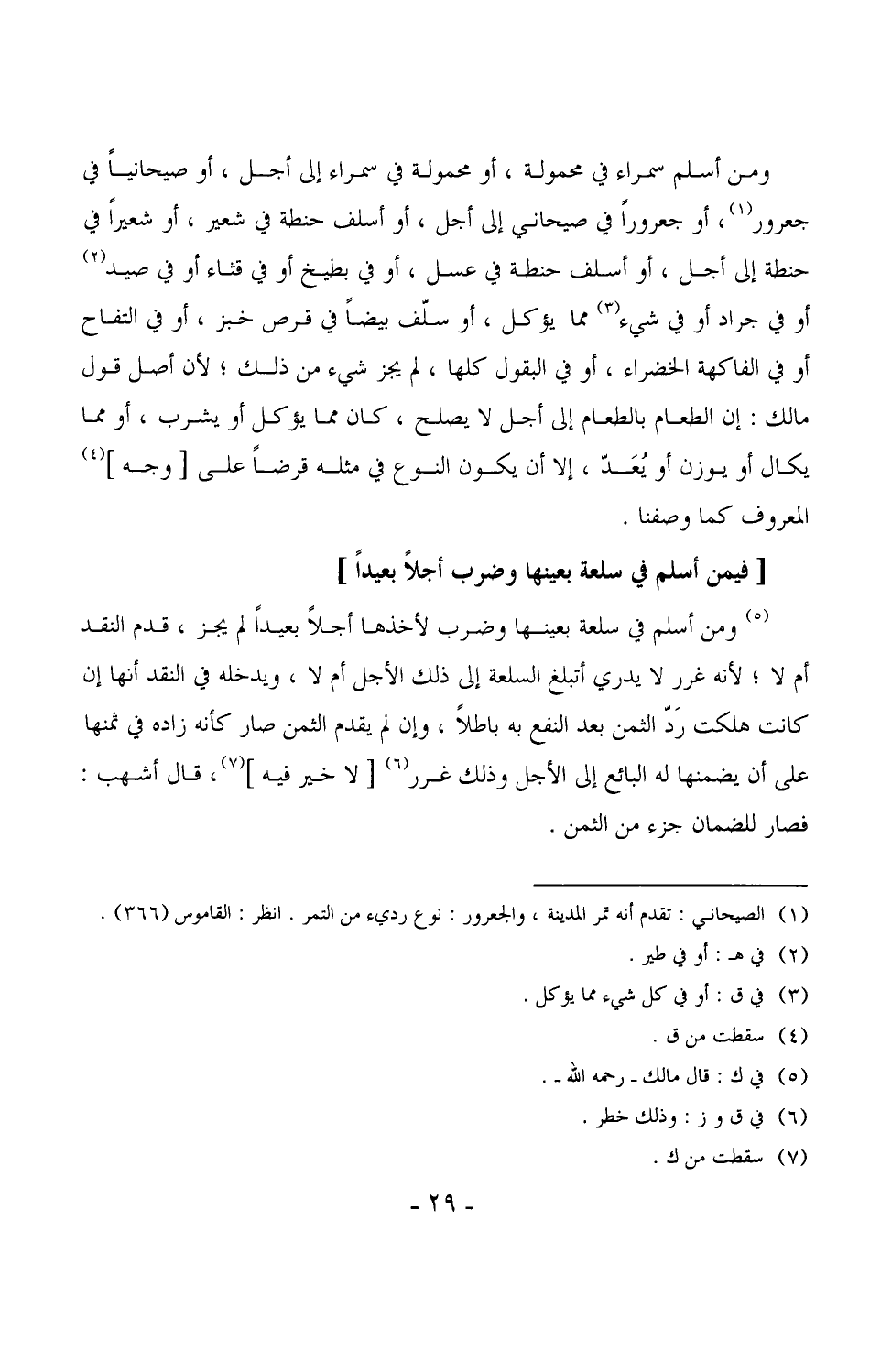 2385 - ومن أسلم في سلعة بعينها وضرب لأخذها أجلاً بعيداً لم يجز، قدم النقد أم لا، لأنه غرر لا يدري أتبلغ السلعة إلى ذلك الأجل أم لا، ويدخله في النقد أنها إن كانت هلكت ردّ الثمن بعد النفع به باطلاً، وإن لم يقدم الثمن صار كأنه زاده في ثمنها على أن يضمنها له البائع إلى الأجل وذلك غرر [لا خير فيه] ، قال أشهب: فصار للضمان جزء من الثمن.