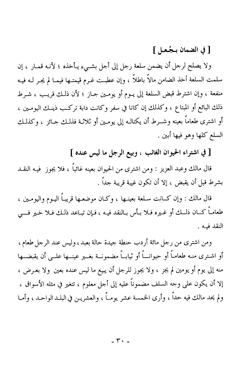 2386 - ولا يصلح لرجل أن يضمن سلعة رجل إلى أجل بشيء يأخذه، لأنه قمار، إن سلمت السلعة أخذ الضامن مالاً باطلاً، وإن عطبت غرم قميتها فيما لم يجر له فيه منفعة، وإن اشترط قبض السلعة إلى يوم أو يومين جاز، لأن ذلك قريب، شرط ذلك البائع أو المبتاع، وكذلك إن كانا في سفر وكانت دابة تركب ذينك اليومين، أو اشترى طعاماً بعينه وشرط أن يكتاله إلى يومين أو ثلاثة فذلك جائز، وكذلك السلع كلها وهو فيها أبين.