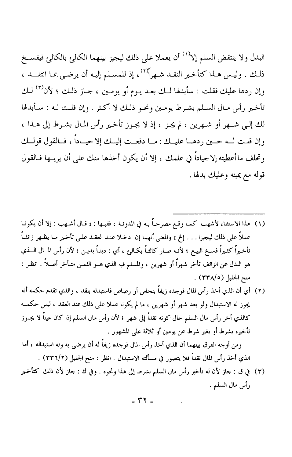 البدل ولا ينتقض السلم إلا أن يعملا على ذلك ليجيز بينهما الكالئ بالكالئ فيفسخ ذلك. وليس هذا كتأخير النقد شهراً، إذ للمسلم إليه أن يرضى بما انتقد، وإن ردها عليك فقلت: سأبدلها لك بعد يوم أو يومين، جاز ذلك، لأن لك تأخير رأس مال السلم بشرط يومين ونحو ذلك لا أكثر. وإن قلت له: سأبدلها لك إلى شهر أو شهرين، لم يجز، إذ لا يجوز تأخير رأس المال بشرط إلى هذا، وإن قلت له حين ردها عليك: ما دفعت إليك إلا جياداً، فالقول قولك وتحلف ما أعطيته إلا جياداً في علمك، إلا أن يكون أخذها منك على أن يريها فالقول قوله مع يمينه وعليك بدلها.