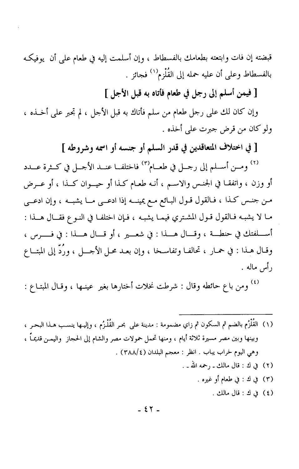 2408 - ومن أسلم إلى رجل في طعام فاختلفا عند الأجل في كثرة عدد أو وزن، واتفقا في الجنس والاسم، أنه طعام كذا أو حيوان كذا، أو عرض من جنس كذا، فالقول قول البائع مع يمينه إذا ادعى ما يشبه، وإن ادعى ما لا يشبه فالقول قول المشتري فيما يشبه، فإن اختلفا في النوع فقال هذا: أسلفتك في حنطة، وقال هذا: في شعير، أو قال هذا: في فرس، وقال هذا: في حمار، تحالفا وتفاسخا، وإن بعد محل الأجل، ورُدّ إلى المبتاع رأس ماله.