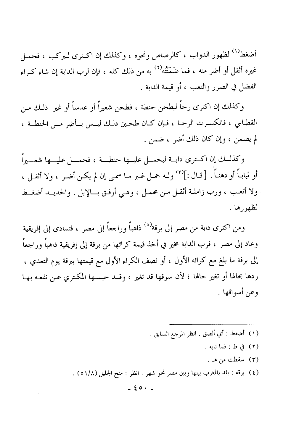3066 - ومن اكترى دابة من مصر إلى برقة ذاهباً وراجعاً إلى مصر، فتمادى إلى إفريقية وعاد إلى مصر، فرب الدابة مخير في أخذ قيمة كرائها من برقة إلى إفريقية ذاهباً وراجعاً إلى برقة ما بلغ مع كرائه الأول، أو نصف الكراء الأول مع قيمتها ببرقة يوم التعدي، ردها بحالها أو تغير حالها، لأن سوقها قد تغير، وقد حبسها المكتري عن نفعه بها وعن أسواقها.