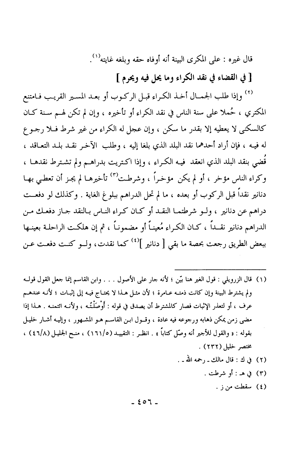 3071 - وإذا طلب الجمال أخذ الكراء قبل الركوب أو بعد المسير القريب فامتنع المكتري، حُملا على سنة الناس في نقد الكراء أو تأخيره، وإن لم تكن لهم سنة كان كالسكنى لا يعطيه إلا بقدر ما سكن، وإن عجل له الكراء من غير شرط فلا رجوع له فيه، فإن أراد أحدهما نقد البلد الذي بلغا إليه، وطلب الآخر نقد بلد التعاقد، قُضي بنقد البلد الذي انعقد فيه الكراء، وإذا اكتريت بدراهم ولم تشترط نقدها، وكراء الناس مؤخر، أو لم يكن مؤخراً، وشرطت تأخيرها لم يجز أن تعطي بها دنانير نقداً قبل الركوب أو بعده، ما لم تحل الدراهم ببلوغ الغاية. وكذلك لو دفعت دراهم عن دنانير، ولو شرطتما النقد أو كان كراء الناس بالنقد جاز دفعك من الدراهم دنانير نقداً، كان الكراء معيناً أو مضموناً، ثم إن هلكت الراحلة بعينها ببعض الطريق رجعت بحصة ما بقي [دنانير] كما نقدت، ولو كنت دفعت عن