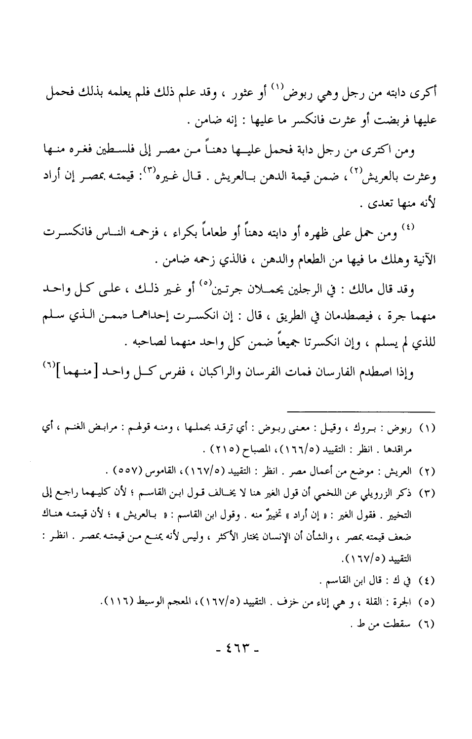 ومن اكترى من رجل دابة فحمل عليها دهناً من مصر إلى فلسطين فغره منها وعثرت بالعريش، ضمن قيمة الدهن بالعريش. قال غيره: قيمته بمصر إن أراد لأنه منها تعدى.