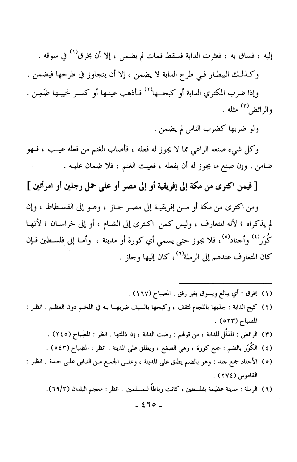 3084 - ومن اكترى من مكة أو من إفريقية إلى مصر جاز، وهو إلى الفسطاط، وإن لم يذكراه، لأنه المتعارف، وليس كمن اكترى إلى الشام، أو إلى خراسان، لأنها كُوَر وأجناد، فلا يجوز حتى يسمي أي كورة أو مدينة، وأما إلى فلسطين فإن كان المتعارف عندهم إلى الرملة، كان إليها وجاز. (¬1)