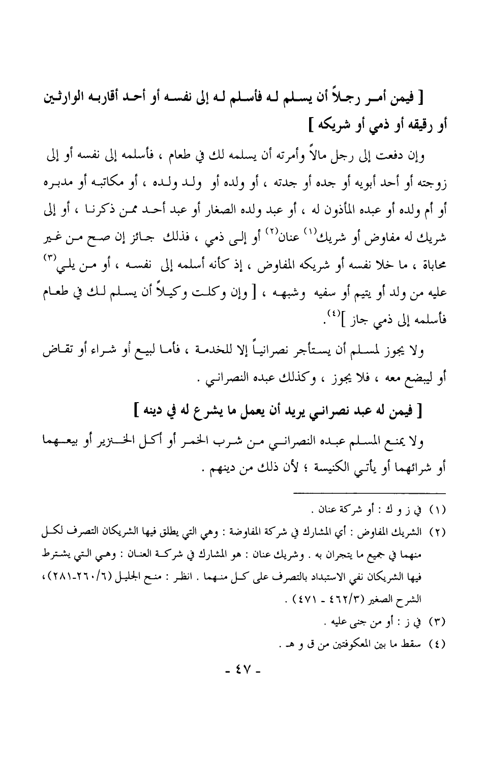 2414 - وإن دفعت إلى رجل مالاً وأمرته أن يسلمه لك في طعام، فأسلمه إلى نفسه وإلى زوجته أو أحد أبويه أو جده أو جدته، أو ولده أو ولد ولده، أو مكاتبه أو مدبره أو أم ولده أو عبده المأذون له، أو عبد ولده الصغار أو عبد أحد ممن ذكرنا، أو إلى شريك له مفاوض أو شريك عنان أو إلى ذمي، فذلك جائز إن صح من غير محاباة، ما خلا نفسه أو شريكه المفاوض، إذ كأنه أسلمه إلى نفسه، أو ن يلي عليه من ولد أو يتيم أو سفيه وشبهه، [وإن وكلت وكيلاً أن يسلم لك في طعام فأسلمه إلى ذمي جاز] .