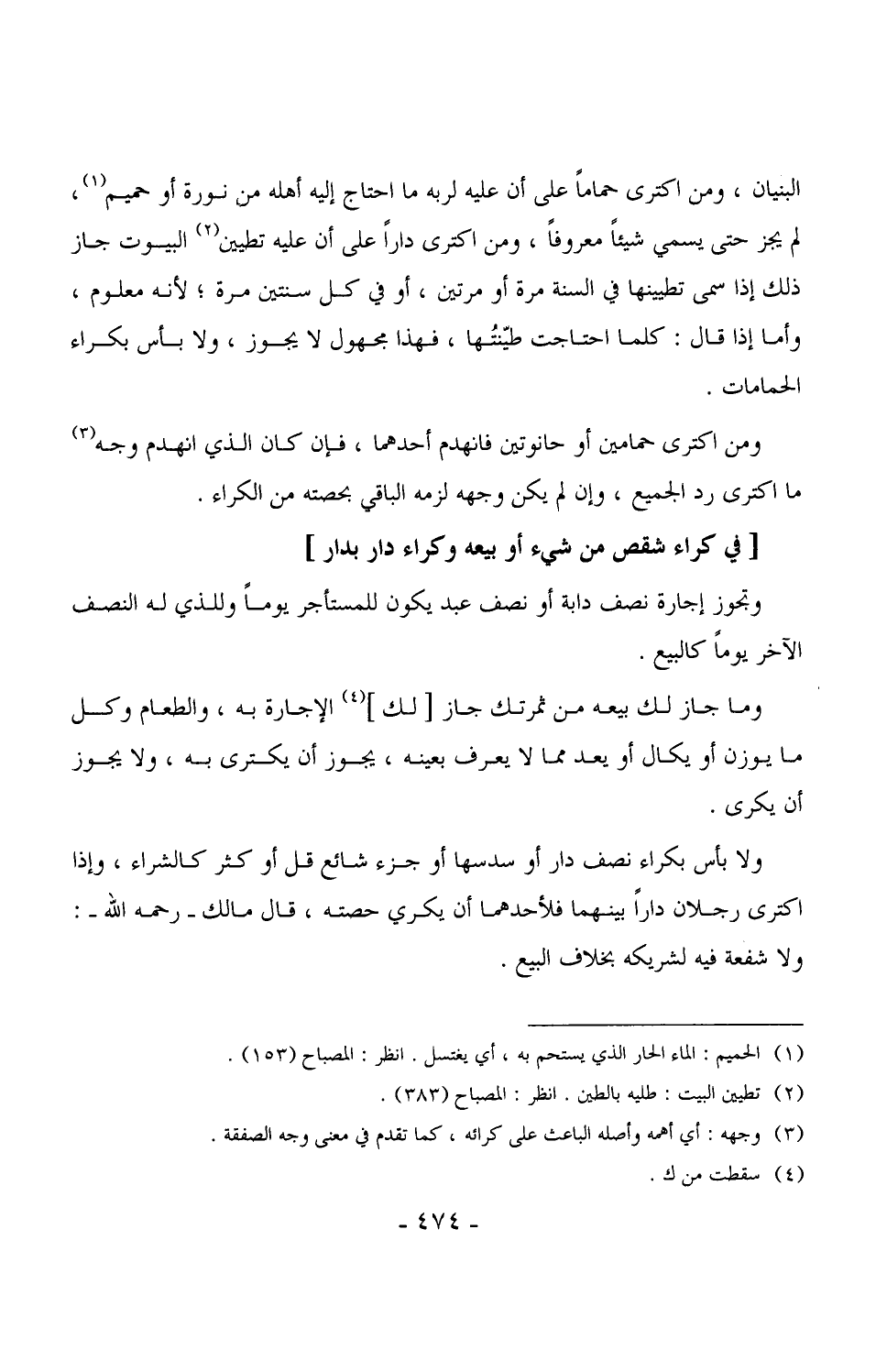 البنيان، ومن اكترى حماماً على أن عليه لربه ما احتاج إليه أهله من نورة أو حميم، لم يجز حتى يسمي شيئاً معروفاً، ومن اكترى داراً على أن عليه تطيين البيوت جاز ذلك إذا سمى تطيينها في السنة مرة أو مرتين، أو في كل سنتين مرة، لأنه معلوم، وأما إذا قال: كلما احتاجت طيّنتها، فهذا مجهول لا يجوز، ولا بأس بكراء الحمامات. (¬1)