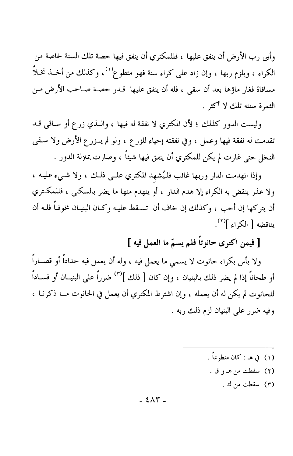 3113 - ولا بأس بكراء حانوت لا يسمي ما يعمل فيه، وله أن يعمل فيه حداداً أو قصاراً أو طحاناً إذ لم يضر ذلك بالبنيان، وإن كان [ذلك] ضرراً على البنيان أو فساداً للحانوت لم يكن له أن يعمله، وإن اشترط المكتري أن يعمل في الحانوت ما ذكرنا، وفيه ضرر على البنيان لزم ذلك ربه. (¬1)