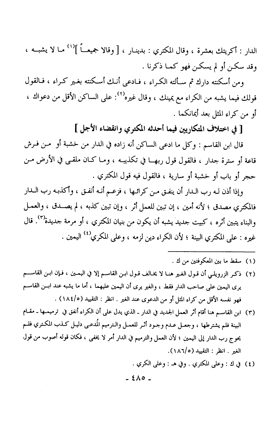 ومن أسكنته دارك ثم سألته الكراء، فادعى أنك أسكنته بغير كراء، فالقول قولك فيما يشبه من الكراء مع يمينك، وقال غيره: على الساكن الأقل من دعواك، أو من كراء المثل بعد أيمانكما.