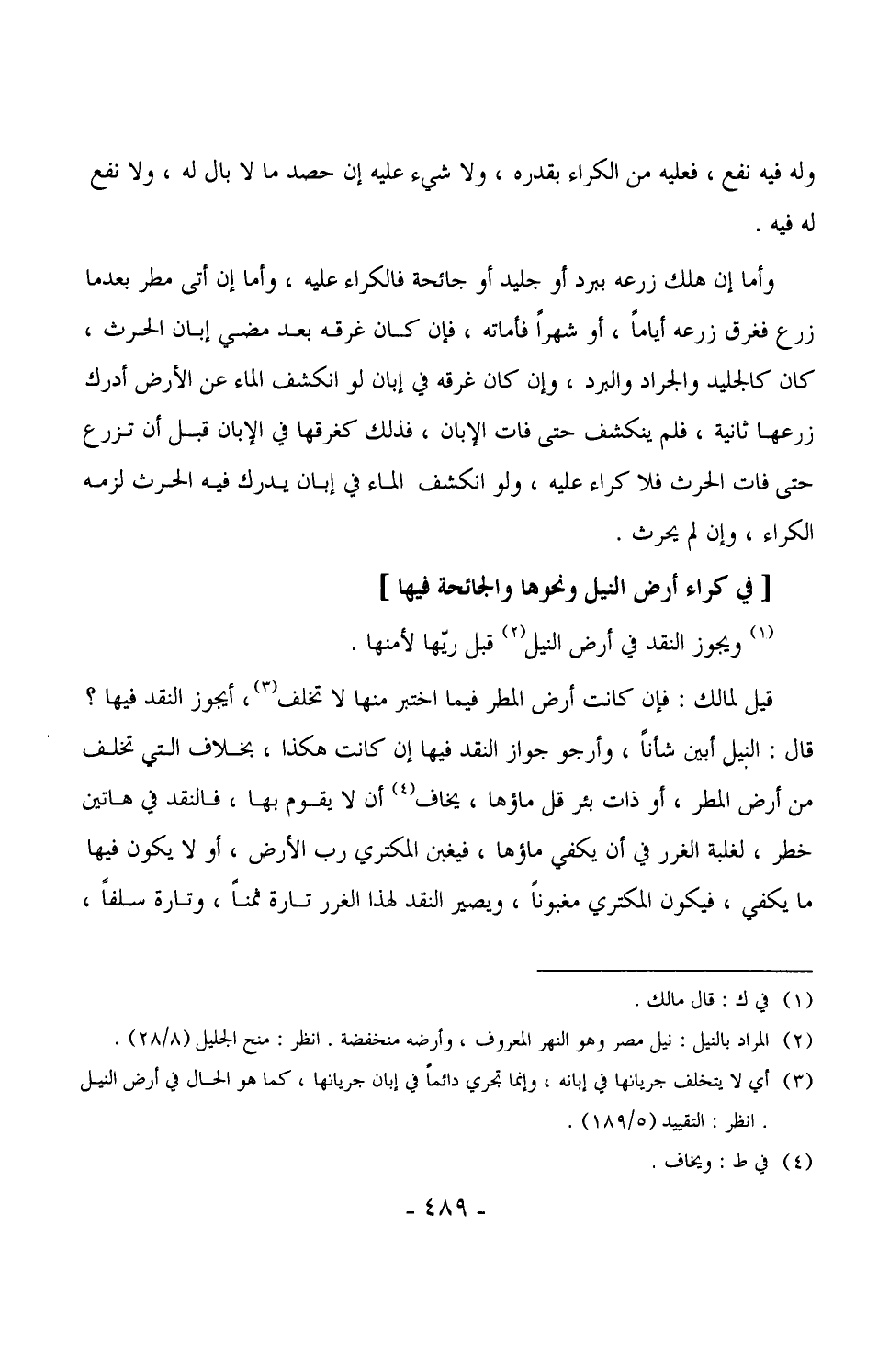 قيل لمالك: فإن كانت أرض المطر فيما اختبر منها لا تخلف، أيجوز النقد فيها؟ قال: النيل أبين شاناً، وأرجو جواز النقد فيها إن كانت هكذا، بخلاف التي تخلف من أرض المطر، أو ذات بئر قل ماؤها، يخاف أن لا يقوم بها، فالنقد في هاتين خطر، لغلبة الغرر في أن يكفي ماؤها، فيغبن المكتري رب الأرض، أو لا يكون فيها ما يكفي، فيكون المكتري مغبوناً، ويصير النقد لهذا الغرر تارة ثمناً، وتارة سلفاً،