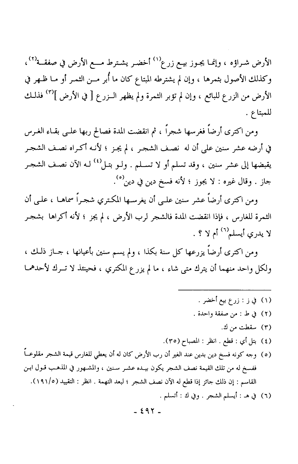 3127 - ومن اكترى أرضاً فغرسها شجراً، ثم انقضت المدة فصالح ربها على بقاء الغرس في أرضه عشر سنين على أن له نصف الشجر، لم يجز، لأنه أكراه نصف الشجر يقبضها إلى عشر سنين، وقد تسلم أو لا تسلم. ولو بتل له الآن نصف الشجر جاز. وقال غيره: لا يجوز، لأنه فسخ دين في دين.