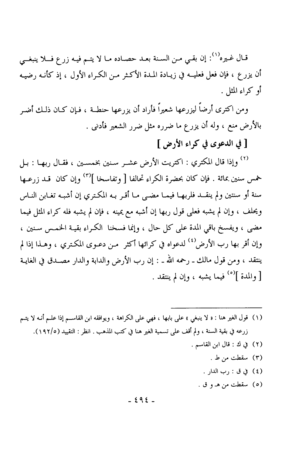 3130 - وإذا قال المكتري: اكتريت الأرض عشر سنين بخمسين، فقال ربها: بل خمس سنين بمائة. فإن كان بحضرة الكراء تحالفا [وتفاسخا] وإن كان قد زرعها سنة أو سنتين ولم ينقد فلربها فيما مضى ما أقر به المكتري إن أشبه تغابن الناس ويحلف، وإن لم يشبه فعلى قول ربها إن أشبه مع يمينه، فإن لم يشبه فله كراء المثل فيما مضى، ويفسخ باقي المدة على كل حال، وإنما فسخنا الكراء بقية الخمس سنين، وإن أقر بها رب الأرض لدعواه في كرائها أكثر من دعوى المكتري، وهذا إذا لم ينتقد، ومن قول مالك - رحمه الله -: إن رب الأرض والدابة والدار مصدق في الغاية [والمدة] فيما يشبه، وإن لم ينتقد.