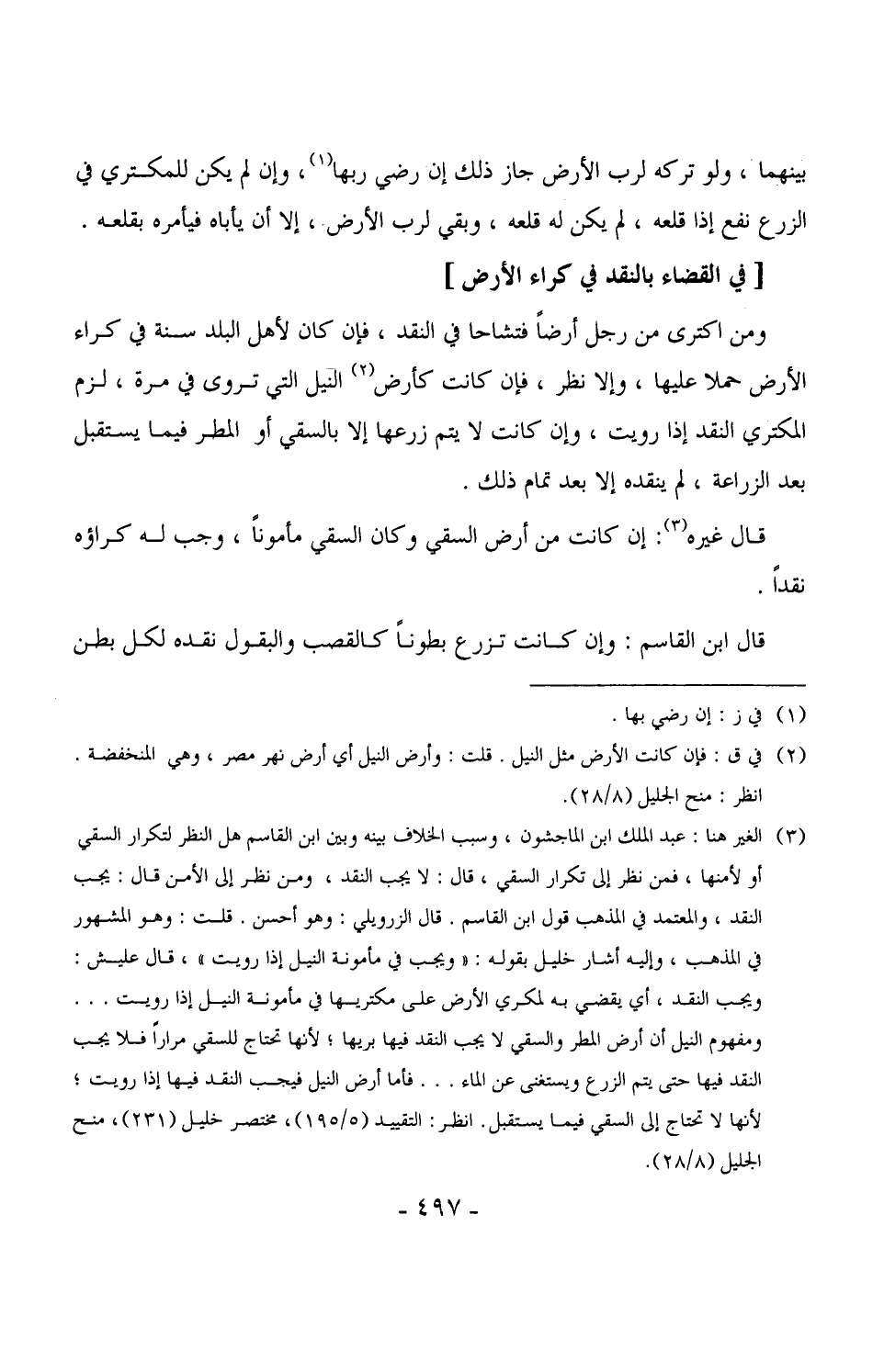 3132 - ومن اكترى من رجل أرضاً فتشاحا في النقد، فإن كان لأهل البلد سنة في كراء الأرض حملا عليها، وإلا نظر، فإن كانت كأرض النيل التي تروى في مرة، لزم المكتري النقد إذا رويت، وإن كانت لا يتم زرعها إلا بالسقي أو المطر فيما يستقبل بعد الزراعة، لم ينقده إلا بعد تمام ذلك. (¬1)