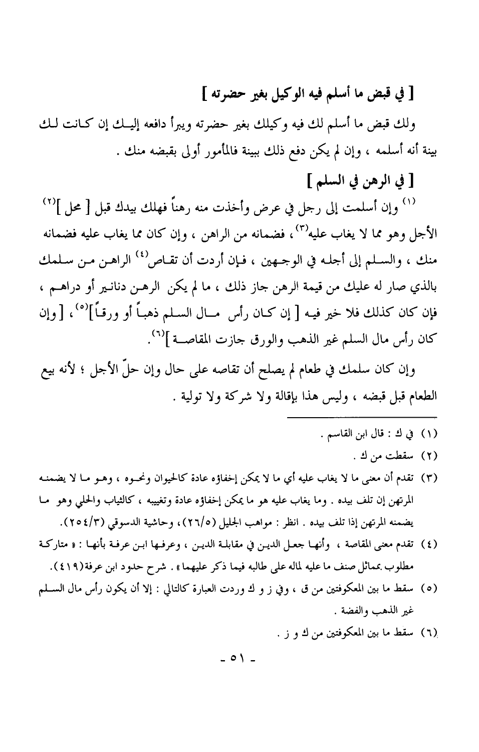 2422 - وإن أسلمت إلى رجل في عرض وأخذت منه رهناً فهلك بيدك قبل [محل] الأجل وهو مما لا يغاب عليه، فضمانه من الراهن، وإن كان مما يغاب عليه فضمانه منك، والسلم إلى أجله في الوجهين، فإن أرادت أن تقاص الراهن من سلمك بالذي صار له عليك من قيمة الرهن جاز ذلك، ما لم يكن الرهن دنانير أو دراهم، فإن كان كذلك فلا خير فيه [إن كان رأس مال السلم ذهباً أو ورقاً] ، [وإن كان رأس مال السلم غير الذهب والورق جازت المقاصة] .