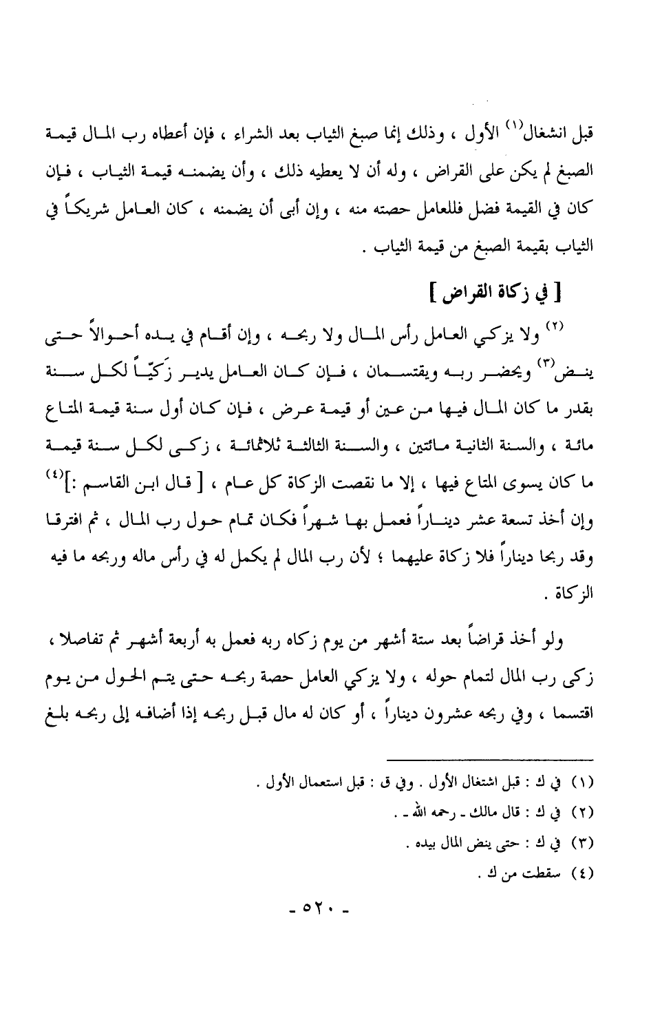 3162 - ولا يزكي العامل رأس المال ولا ربحه، وإن أقام في يده أحوالاً حتى ينض ويحضر ربه ويقتسمان، فإن كان العامل يدير زَكيّاً لكل سنة بقدر ما كان المال فيه من عين أو قيمة عرض، فإن كان أول سنة قيمة المتاع مائة، والسنة الثانية مائتين، والسنة الثالثة ثلاثمائة، زكى لكل سنة قيمة ما كان يسوى المتاع فيها، إلا ما نقصت الزكاة كل عام، [قال ابن القاسم:] وإن أخذ تسعة عشر ديناراً فعمل بها شهراً فكان تمام حول رب المال، ثم افترقا وقد ربحا ديناراً فلا زكاة عليهما، لأن رب المال لم يكمل له في رأس ماله وربحه ما فيه الزكاة.