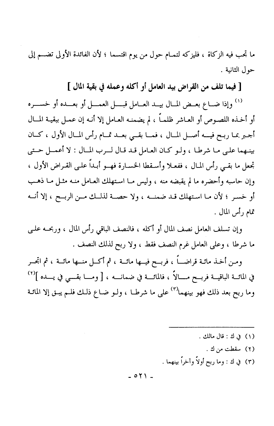 3163 - وإذا ضاع بعض المال بيد العامل قبل العمل أو بعده أو خسره أو أخذه اللصوص أو العاشر ظلماً، لم يضمنه العامل إلا أنه إن عمل ببقية المال أجبر بما ربح فيه أصل المال، فما بقي بعد تمام رأس المال الأول، كان بينهما على ما شرطا، ولو كان العامل قد قال لرب المال: لا أعمل حتى تجعل ما بقي رأس المال، ففعلا وأسقطا الخسارة فهو أبداً على القراض الأول، وإن حاسبه وأحضره ما لم يقبضه منه، وليس ما استهلك العامل منه مثل ما ذهب أو خسر، لأن ما استهلك قد ضمنه، ولا حصة لذلك من الربح، إلا أنه تمام رأس المال.