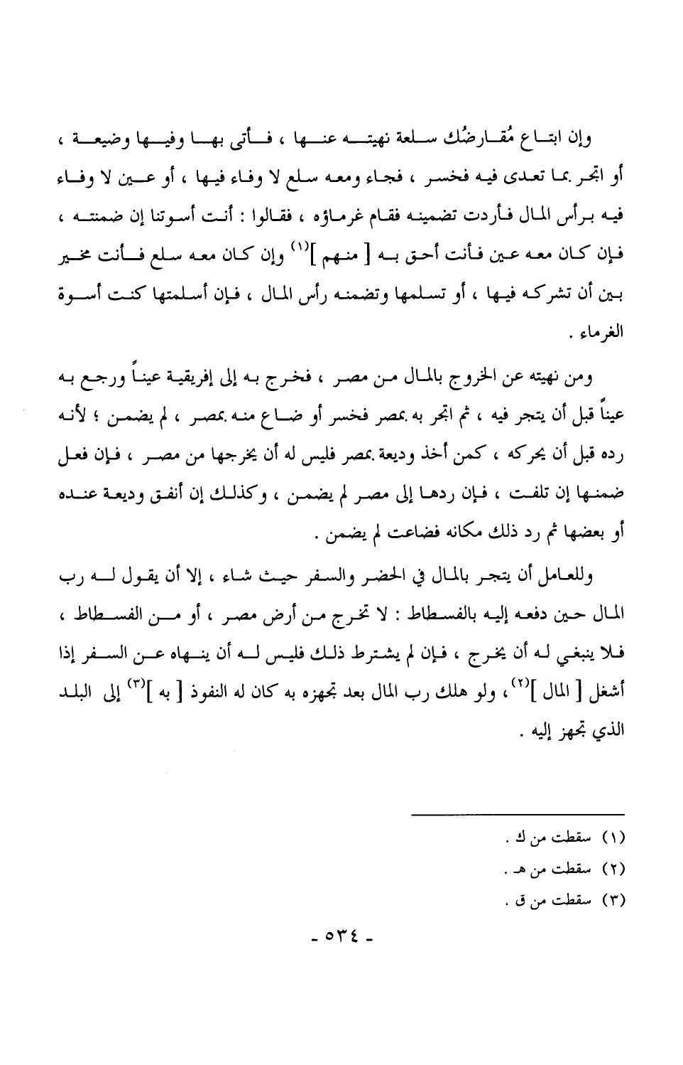 3186 - ومن نهيته عن الخروج بالمال من مصر، فخرج به إلى إفريقية عيناً ورجع به عيناً قبل أن يتجر فيه، ثم اتجر به بمصر فخسر أو ضاع منه بمصر، لم يضمن، لأنه رده قبل أن يحركه، كمن أخذ وديعة بمصر فليس له أن يخرجها من مصر، فإن فعل ضمنها إن تلفت، فإن ردها إلى مصر لم يضمن، وكذلك إن أنفق وديعة عنده أو بعضها ثم رد ذلك مكانه فضاعت لم يضمن.