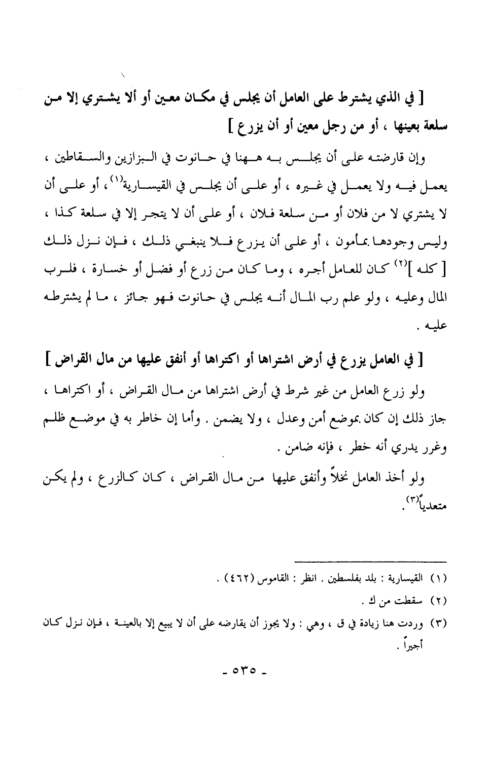 3187 - وإن قارضته على أن يجلس به ههنا في حانوت في البزازين والسقاطين، يعمل فيه ولا يعمل في غيره، أو على أن يجلس في القيسارية، أو على أن لا يشتري لا من فلان أو من سلعة فلان، أو على أن لا يتجر إلا في سلعة كذا، وليس وجودها بمأمون، أو على أن يزرع فلا ينبغي ذلك، فإن نزل ذلك [كله] كان للعامل أجره، وما كان من زرع أو فضل أو خسارة، فلرب المال وعليه، ولو علم رب المال أنه يجلس في حانوت فهو جائز، ما لم يشترطه عليه.
