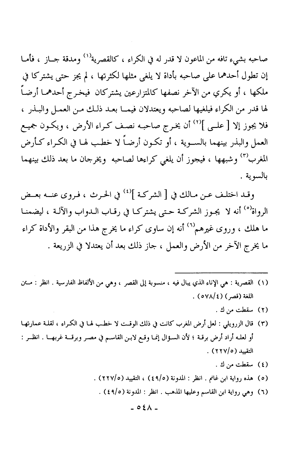 3211 - وقد اختلف عن مالك في [الشركة] في الحرث، فروى عنه بعض الرواة أنه لا يجوز الشركة حتى يشتركا في رقاب الدواب والآلة، ليضمنا ما هلك، وروى غيرهم أنه إن ساوى كراء ما يخرج هذا من البقر والأداة كراء ما يخرج الآخر من الأرض والعمل، جاز ذلك بعد أن يعتدلا في الزريعة.