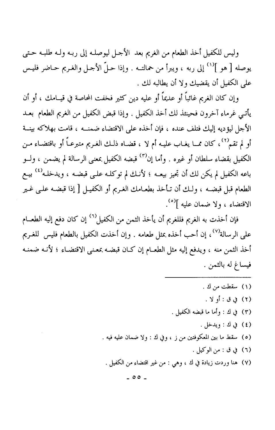 2428 - وإن كان الغريم غائباً أو عديماً أو عليه دين كثير فخفت المحاصة في قيامك، أو أن يأتي غرماء آخرون فحينئذ لك أخذ الكفيل. وإذا قبض الكفيل من الغريم الطعام بعد الأجل ليؤديه إليك فتلف عنده، فإن أخذه على الاقتضاء ضمنه، قامت بهلاكه بينة أو لم تقم، كان مما يغاب عليه أم لا، قضاه ذلك الغريم متبرعاً أو باقتضاء من الكفيل بقضاء سلطان أو غيره. وأما إن قبضه الكفيل بمعنى الرسالة لم يضمن، ولو باعه الكفيل لم يكن لك أن تجيز بيعه، لأنك لم توكله على قبضه، ويدخله بيع الطعام قبل قبضه، ولك أن تأخذ بطعامك الغريم أو الكفيل [إذا قبضه على غير الاقتضاء، ولا ضمان عليه] .