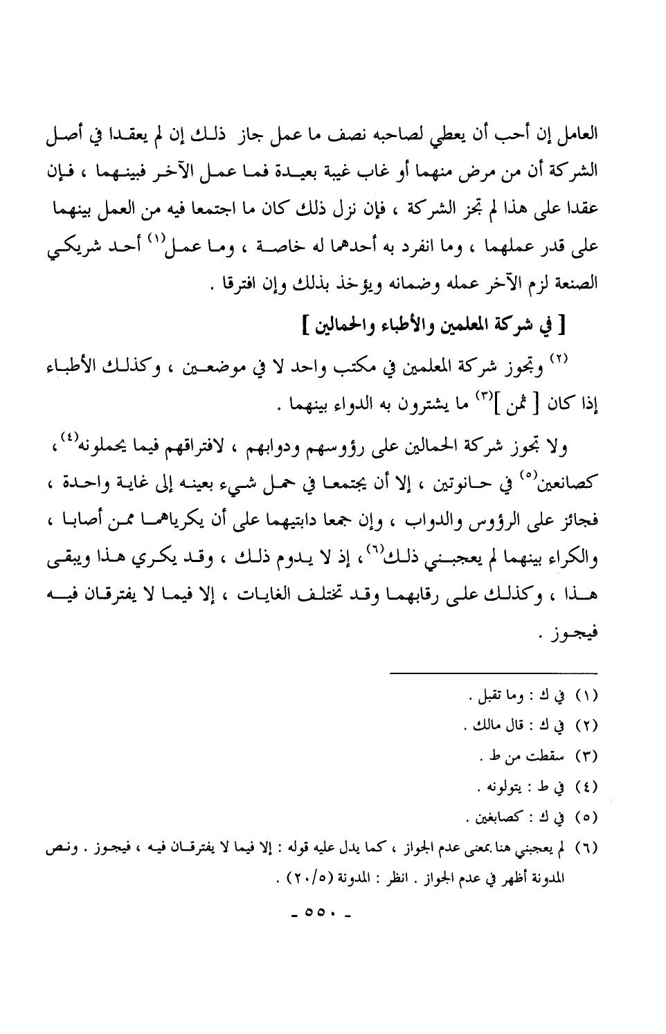 3213 - وتجوز شركة المعلمين في مكتب واحد لا في موضعين، وكذلك الأطباء إذا كان [ثمن] ما يشترون به الدواء بينهما.