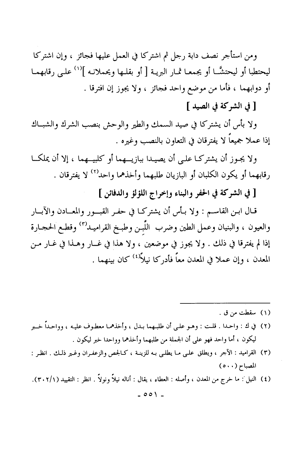 3215 - ولا بأس أن يشتركا في صيد السمك والطير والوحش بنصب الشرك والشباك إذا عملا جميعاً لا يفترقان في التعاون بالنصب وغيره. (¬1)