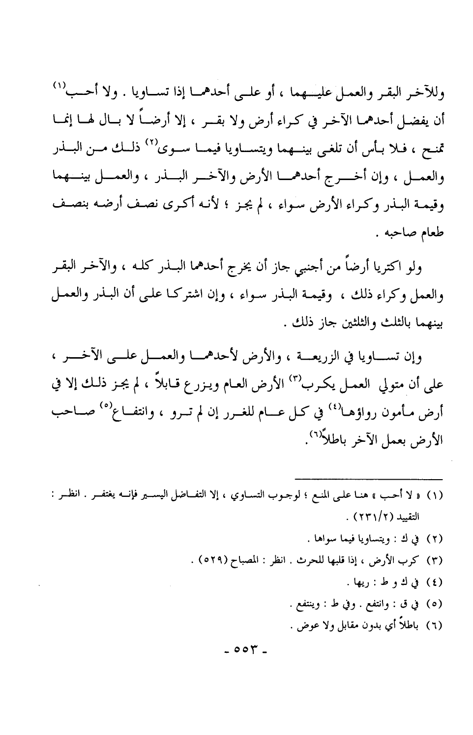 3219 - وإن تساويا في الزريعة، والأرض لأحدهما والعمل على الآخر، على أن متولي العمل يكرب الأرض العام ويزرع قابلاً، لم يجز ذلك إلا في أرض مأمون رواؤها في كل عام للغرر إن لم ترو، وانتفاع صاحب الأرض بعمل الآخر باطلاً.