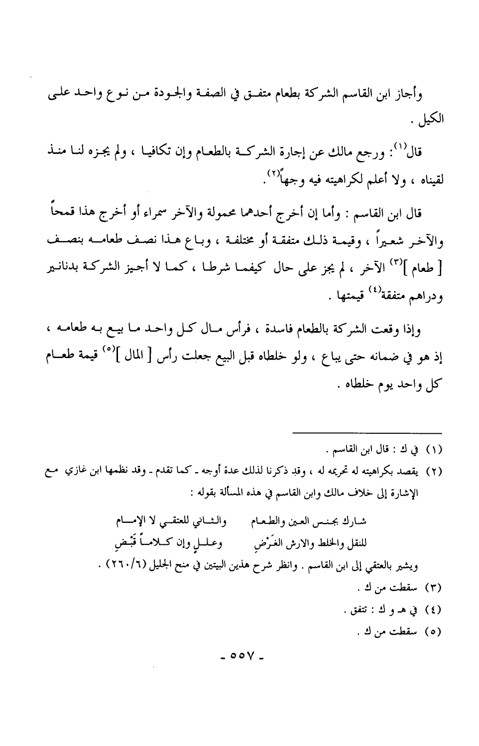 وأجاز ابن القاسم الشركة بطعام متفق في الصفة والجودة من نوع واحد على الكيل.