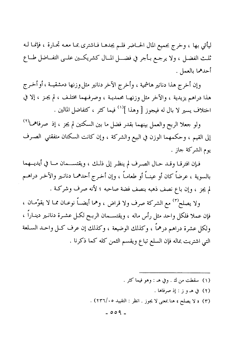 3228 - ولا يصلح مع الشركة صرف ولا قراض، وهما أيضاً نوعان مما لا يقوّمان، فإن عملا فلكل واحد مثل رأس ماله، ويقتسمان الربح لكل عشرة دنانير ديناراً، ولكل عشرة دراهم درهماً، وكذلك الوضيعة، وكذلك إن عرف كل واحد السلعة التي اشتريت بماله فإن السلع تباع ويقسم الثمن كله كما ذكرنا. (¬1)