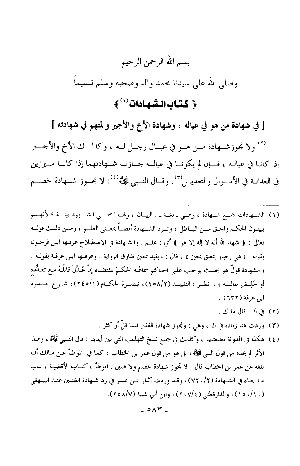 3261 - ولا تجوز شهادة من هو في عيال رجل له، وكذلك الأخ والأجير إذا كانا في عياله، فإن لم يكونا في عياله جازت شهادتهما إذا كانا مبرزين في العدالة في الأموال والتعديل. وقال النبي ÷: لا تجوز شهادة خصم