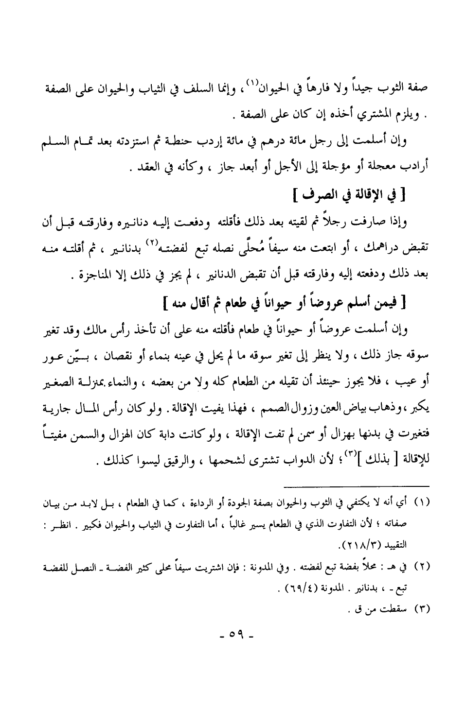 2434 - وإن أسلمت عروضاً أو حيواناً في طعام فأقلته منه على أن تأخذ رأس مالك وقد تغير سوقه جاز ذلك، ولا ينظر إلى تغير سوقه ما لم يحل في عينه بنماء أو نقصان، بيّن عور أو عيب، فلا يجوز حينئذ أن تقيله من الطعام كله ولا من بعضه، والنماء بمنزلة الصغير يكبر، وذهاب بياض العين وزوال الصمم، فهذا يفيت الإقالة. ولو كان رأس المال جارية فتغيرت في بدنها بهزال أو سمن لم تفت الإقالة، ولو كانت دابة كان الهزال والسمن مفيتاً للإقالة [بذلك] ، لأن الدواب تشترى لشحمها، والرقيق ليسوا كذلك.